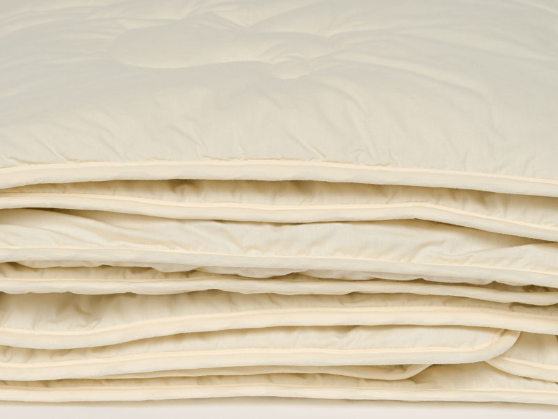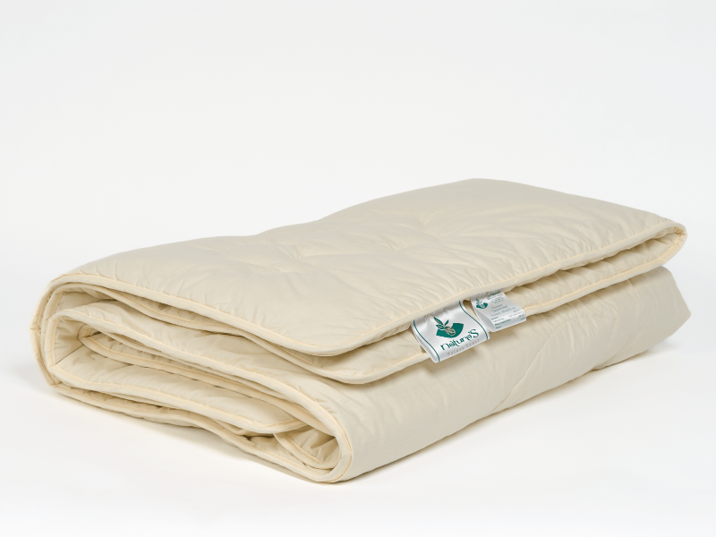 Ткань чехла: 100% хлопок —мерсеризованный тик полотняного переплетения из длинноволокнистого хлопка, обеспечивающего отсутствие ворсистости и однородность ткани. Высокая плотность: 206/155 нитей на 10 см²,135 г/м². Цвет золотисто-бежевый. Подобного качества ткань технологически необходима для использования с верблюжьей шерстью.