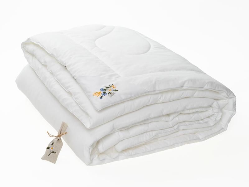 Всесезонное одеяло коллекции «Ромашка Антистресс» выполнено из высококачественного хлопка белого цвета особо плотного плетения, внутри — антибактериальное бамбуковое волокно. Дизайн одеяла дополнен удобным кармашком с оригинальной вышивкой, в который можно поместить саше, наполненное натуральными высушенными цветочками ромашки аптечной и входящее в комплект этого изделия.