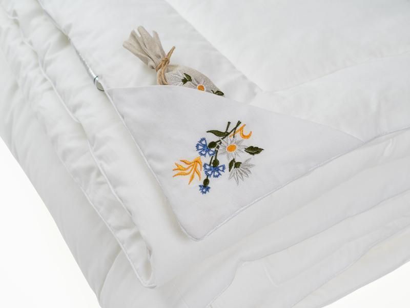 Всесезонное одеяло коллекции «Ромашка Антистресс» выполнено из высококачественного хлопка белого цвета особо плотного плетения, внутри — антибактериальное бамбуковое волокно. Дизайн одеяла дополнен удобным кармашком с оригинальной вышивкой, в который можно поместить саше, наполненное натуральными высушенными цветочками ромашки аптечной и входящее в комплект этого изделия.