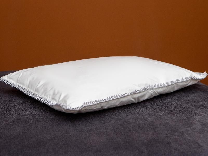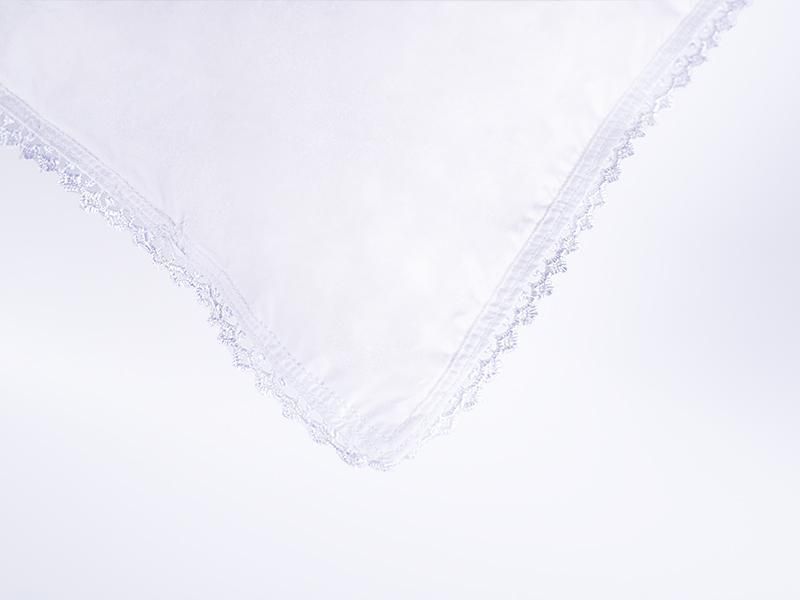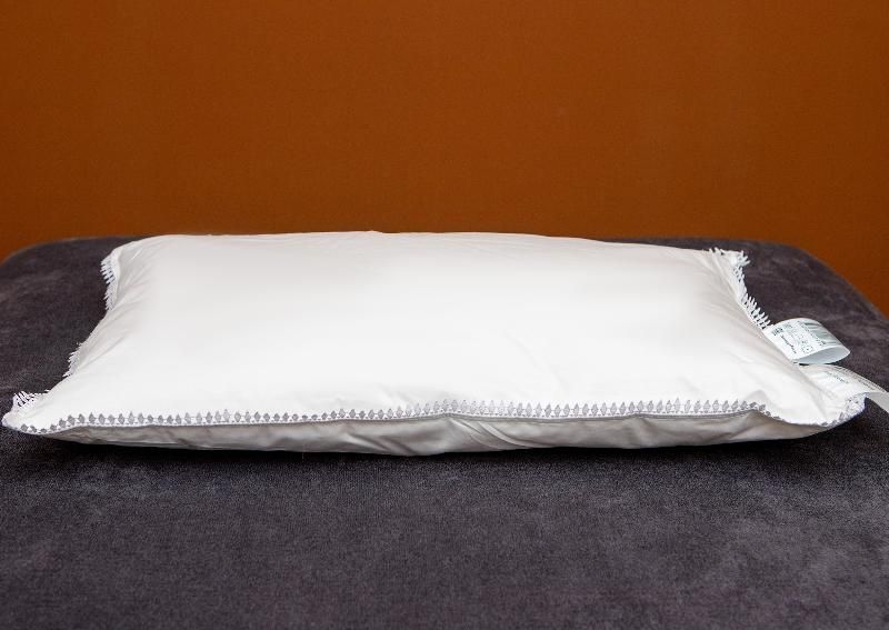 Технология пошива подушки: Классическая конструкция, по периметру белое кружево и двойная отделочная строчка, которая исключает миграцию наполнителя через швы.