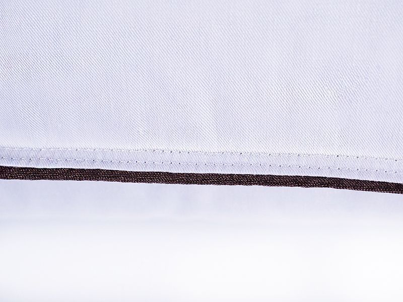 Ткань чехла: 100% хлопок —мерсеризованный тик полотняного переплетения из длинноволокнистого хлопка, обеспечивающего отсутствие ворсистости и однородность ткани. Высокая плотность: 206/155 нитей на 10 см²,135 г/м². Цвет белый, кант шоколадного цвета.