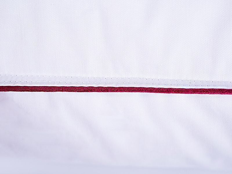 Ткань чехла: 100% хлопок —мерсеризованный тик полотняного переплетения из длинноволокнистого хлопка, обеспечивающего отсутствие ворсистости и однородность ткани. Высокая плотность: 206/155 нитей на 10 см²,135 г/м². Цвет белый, кант шоколадного цвета.