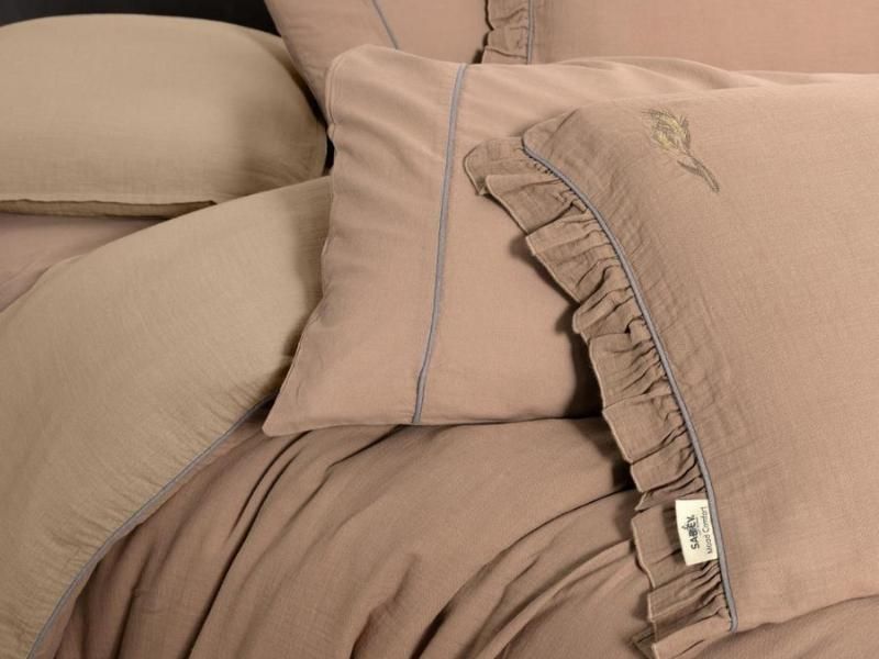 Материал из которого изготовлено постельное белье напоминает ткань с «мятой» или жатой структурой. Для его производства используют только 100% хлопок. Жатое постельное белье обеспечивает хорошую циркуляцию воздуха, благодаря чему, кожа «дышит». Комплект имеет высокие прочностные характеристики и выдерживает длительный период интенсивной эксплуатации.